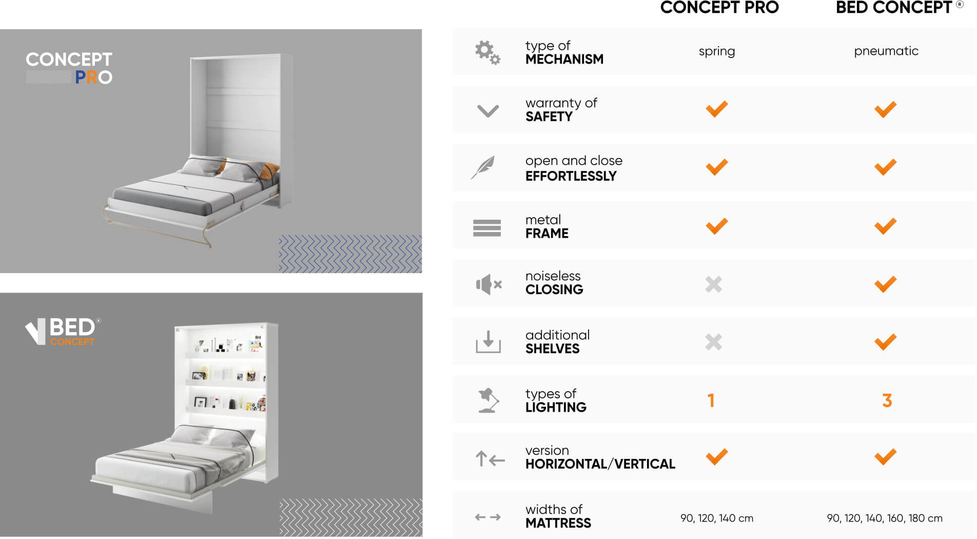 Every room is different and has a unique functionality and size. This is why we offer both vertical and horizontal Murphy beds with mattresses of different widths and stylish color options. So you can adjust the furniture to your individual needs, and the needs of your interior arrangement.